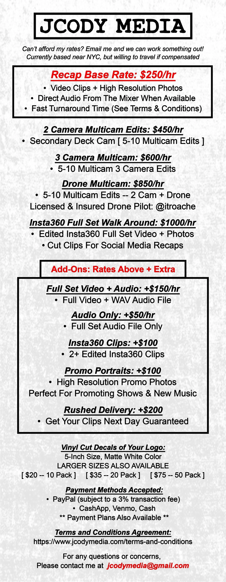 Pricing HOME HOME jcodymedia@gmail.com TERMS AND CONDITIONS LINK UPCOMING EVENTS PREVIOUS EVENTS PREVIOUS YEARS:2024